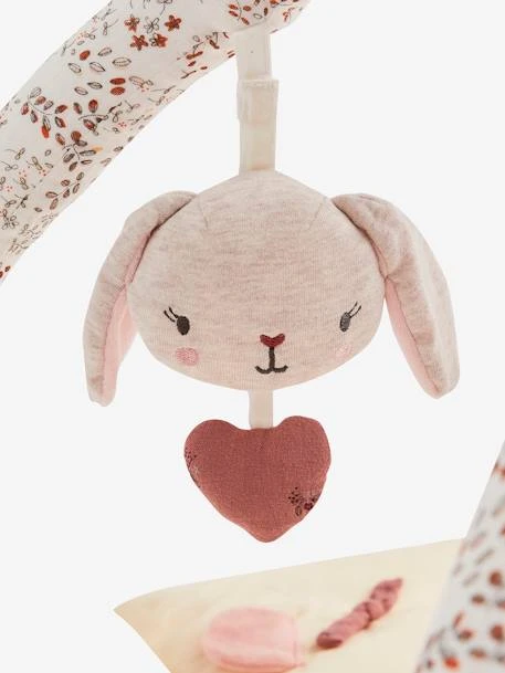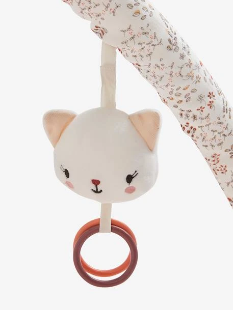 - Sur les arches : 3 jouets suspendus : un chat avec 2 anneaux en plastique colorés, une souris avec anneau en plastique transparent et billes colorées, 1 lapin “pouet pouet” avec un cœur