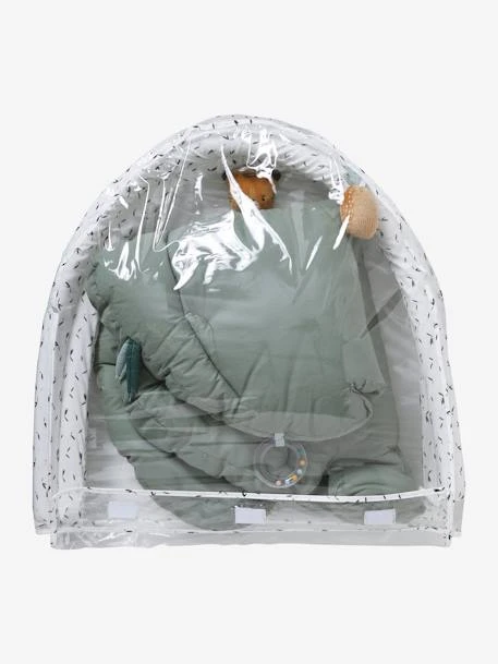 • Jouets sur le tapis : 1 éléphant en velours avec boîte à musique, 1 anneau de dentition, 1 miroir, 1 anneau à billes, des rubans et 2 feuilles en coton